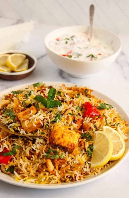 Biryani is fragrant basmati delicacy prepared by simmering rice and meat or vegetable together with raisins, almonds, cashews, fresh cilantro and aromatic spices with fresh mint and raita on side