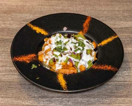 A deep-fried, hollow puri filled with a mixture of potatoes, chickpeas, yogurt, and tamarind sauce